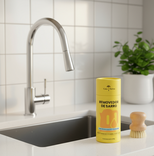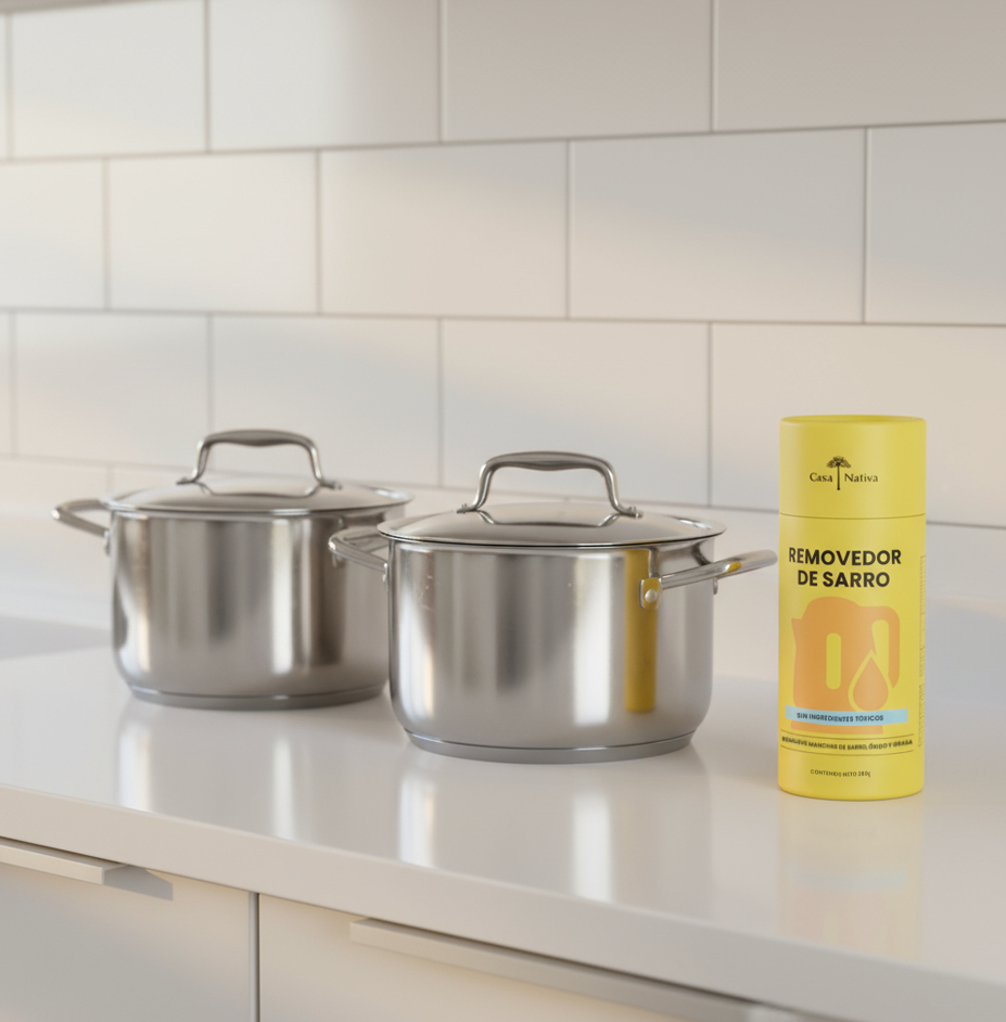 Remueve manchas de sarro, óxido y grasa sin esfuerzo, dejando griferías, hervidores, ollas y sartenes impecables, y al mismo tiempo cuida del planeta con una composición consciente.