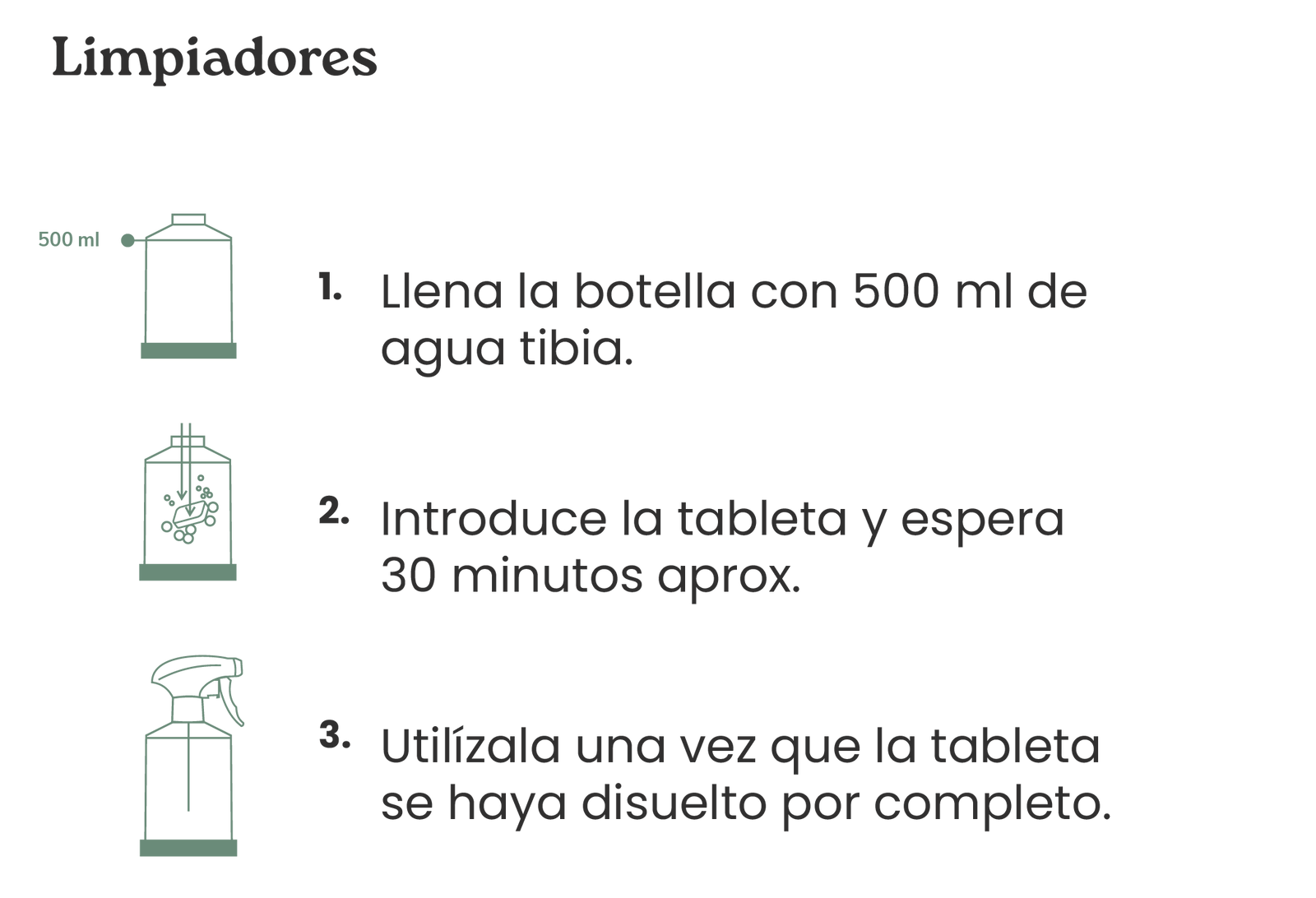*Para evitar desperdicios, la botella cubre los 350ml de manera exacta, solo debes llenarla hasta el cuello dejando espacio para la tableta. Procura usar botellas dispensadoras de espuma.