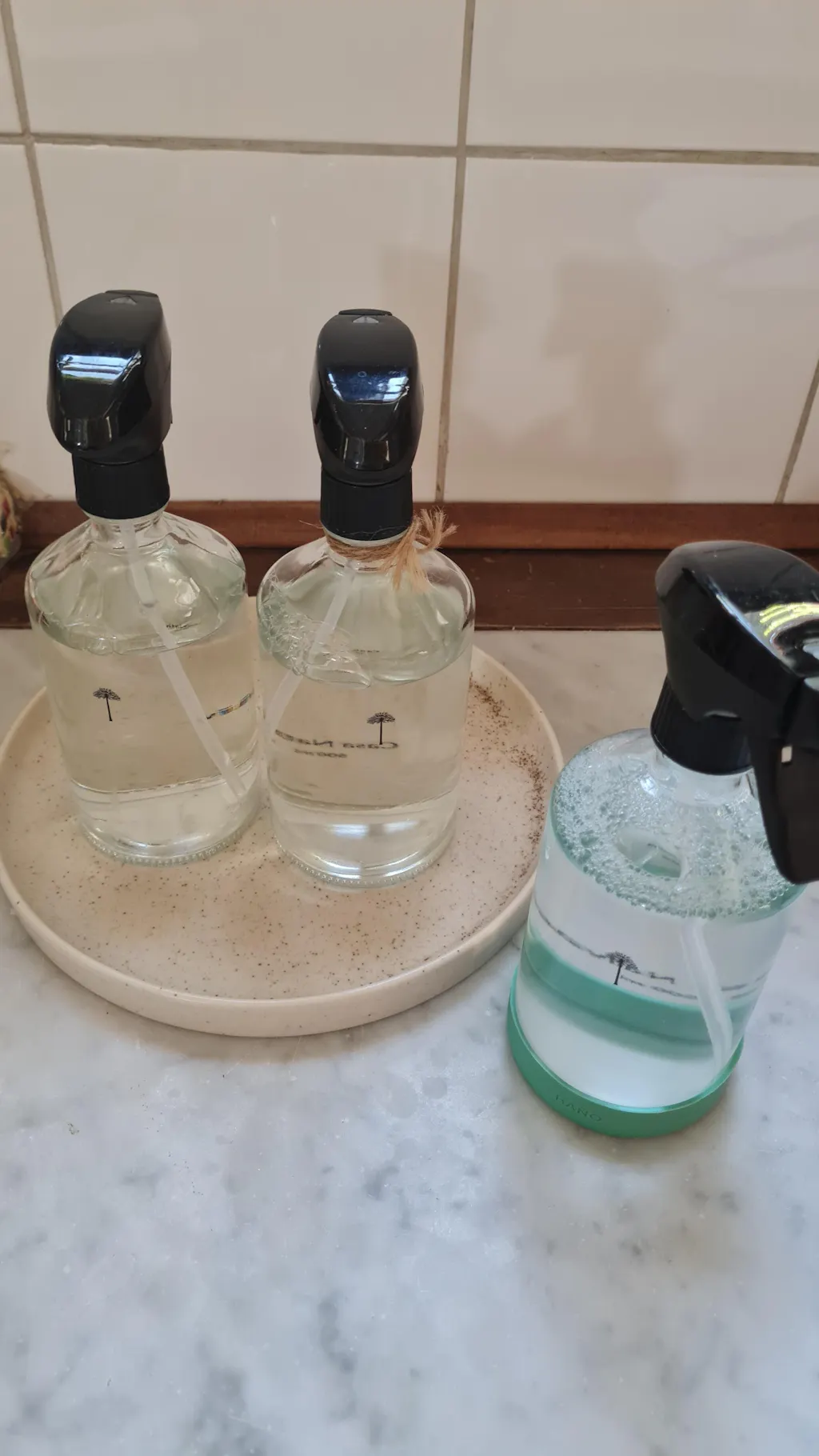 La botella es de muy buena calidad. La recomiendo totalmente. Todavía no uso el limpiador de baño